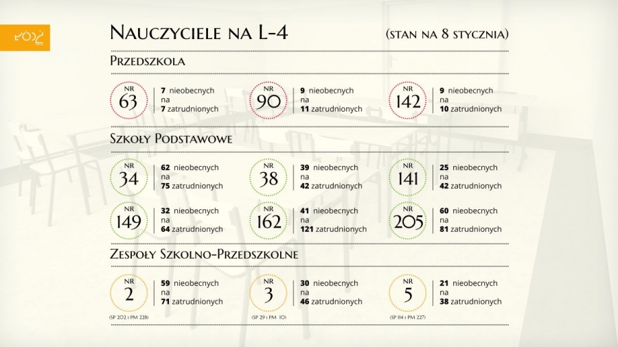 Wiceprezydent Trela wskazuje również, że w części szkół i przedszkoli na terenie miasta sytuacja wygląda naprawdę dramatycznie. W przedszkolu nr 63 na zwolnieniu przebywają wszyscy nauczyciele, w przedszkolu nr 90 nieobecnych jest 9 na 11 pedagogów, a w przedszkolu nr 142 na 10 zatrudnionych nieobecnych jest 9.
